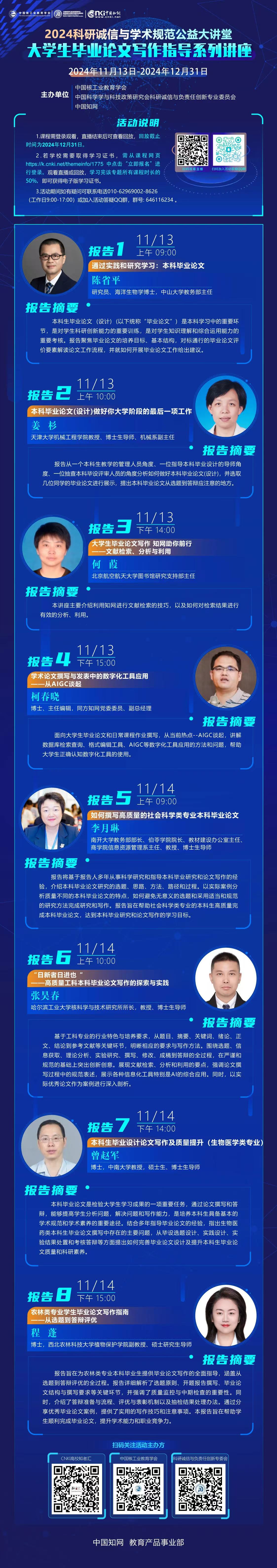 为深入贯彻落实国家关于加强科研诚信与作风学风建设的相关要求,营造求真务实的学术氛围和科研环境,弘扬诚信文化,树立良好学风,中国知网特联合中国核工业教育学会、中国科学学与科技政策研究会科研诚信与负责任创新专业委员会共同组织“2024科研诚信与学术规范公益大讲堂——大学生毕业论文写作指导系列讲座的通知”线上讲座活动。讲座内容涵盖涵盖毕业论文(设计)的培养目标、基本结构、工作流程的介绍,文献检索、分析和利用,论文撰写过程中各种信息化工具的应用等,并邀请文科类、工科类、医学类、农林类专业优秀指导老师讲解毕业论文(设计)的写作经验。