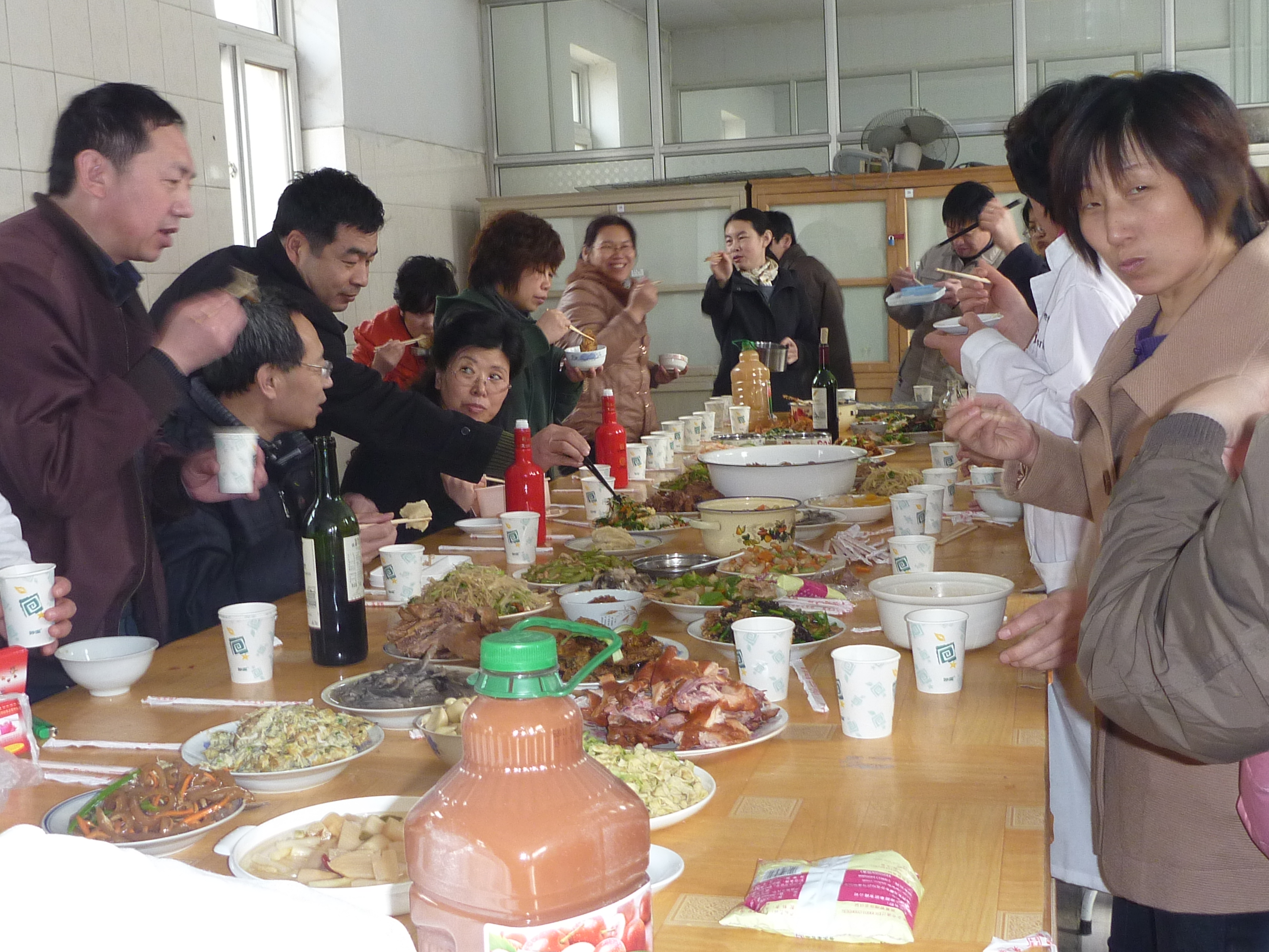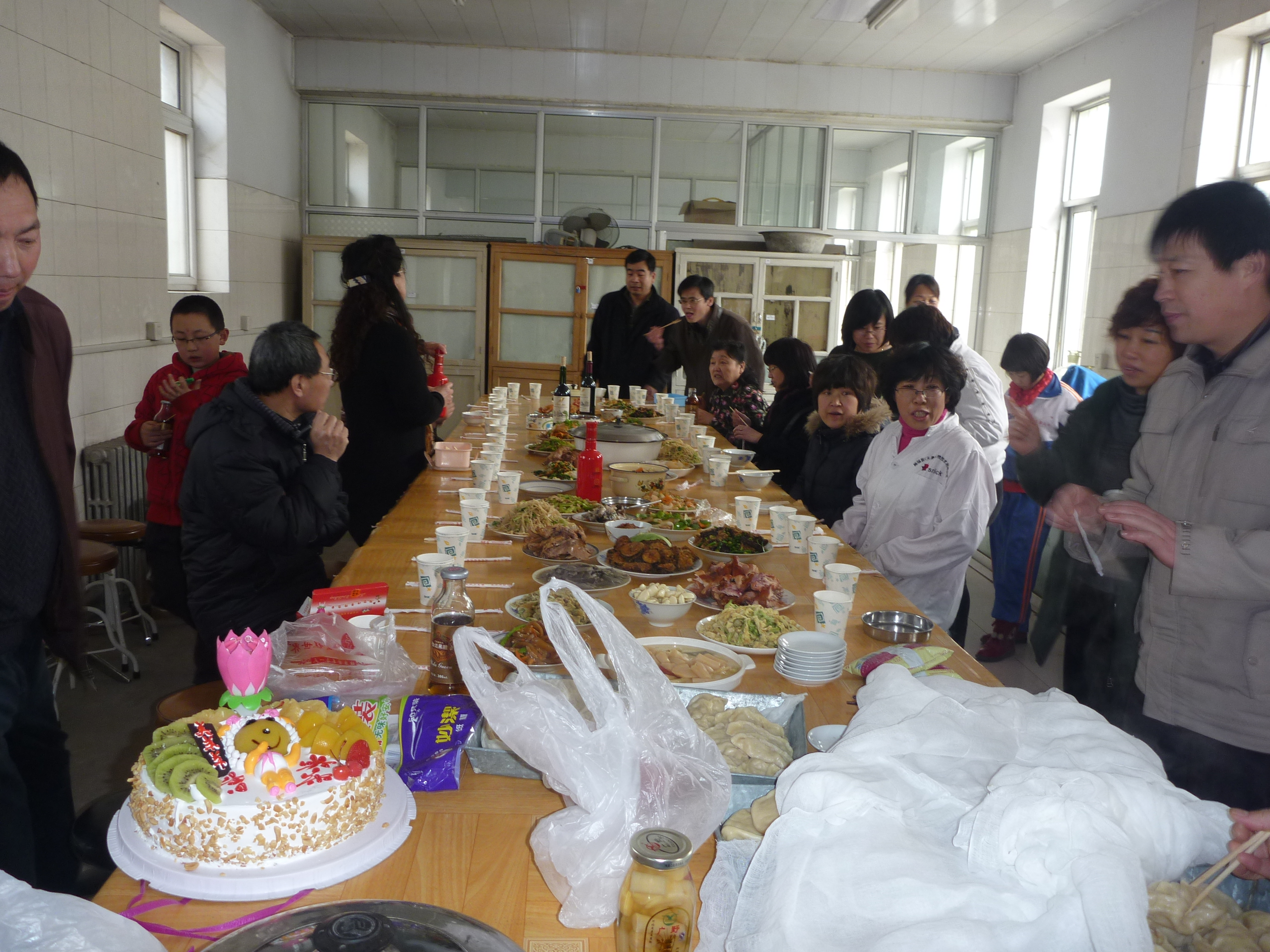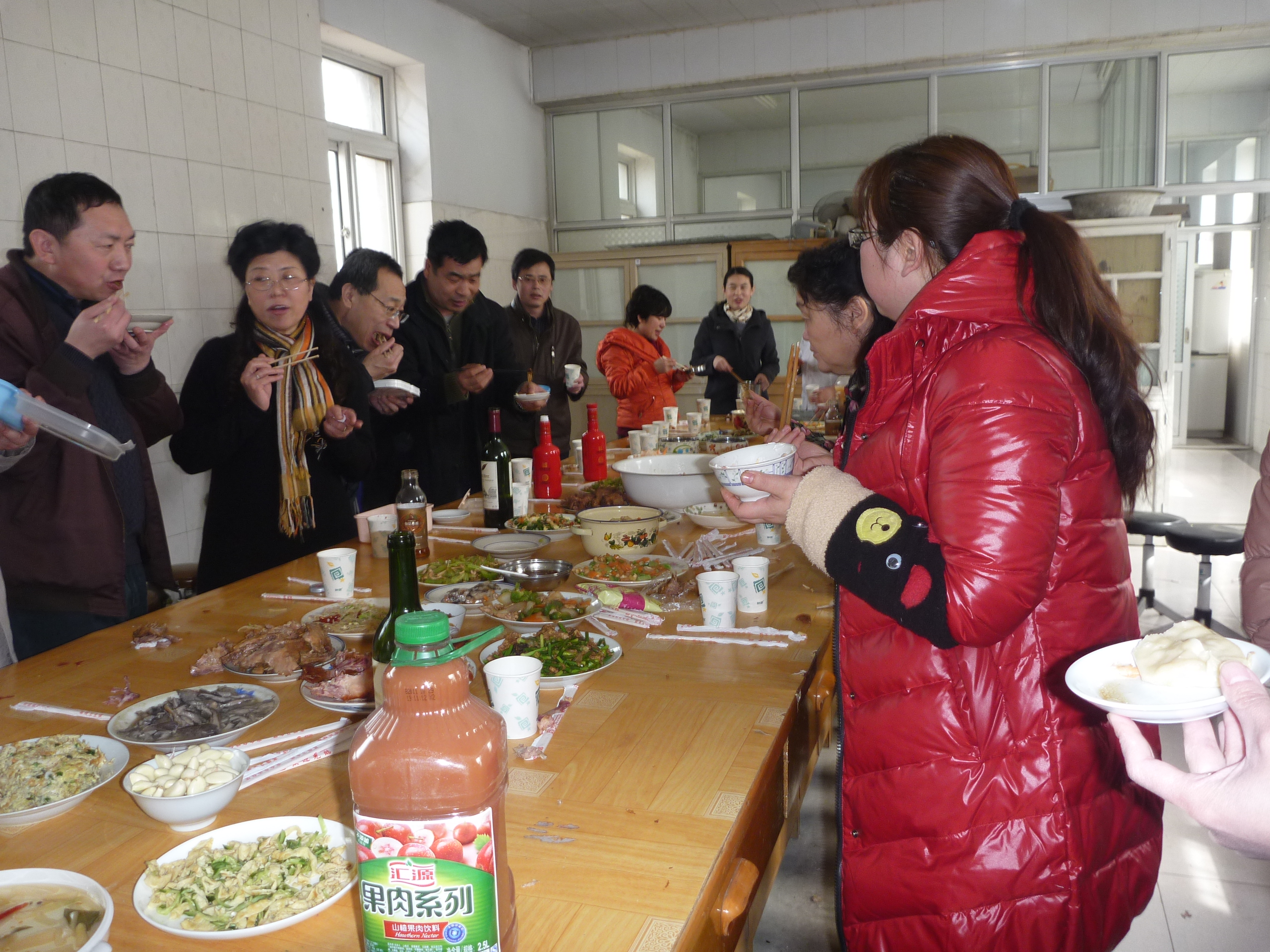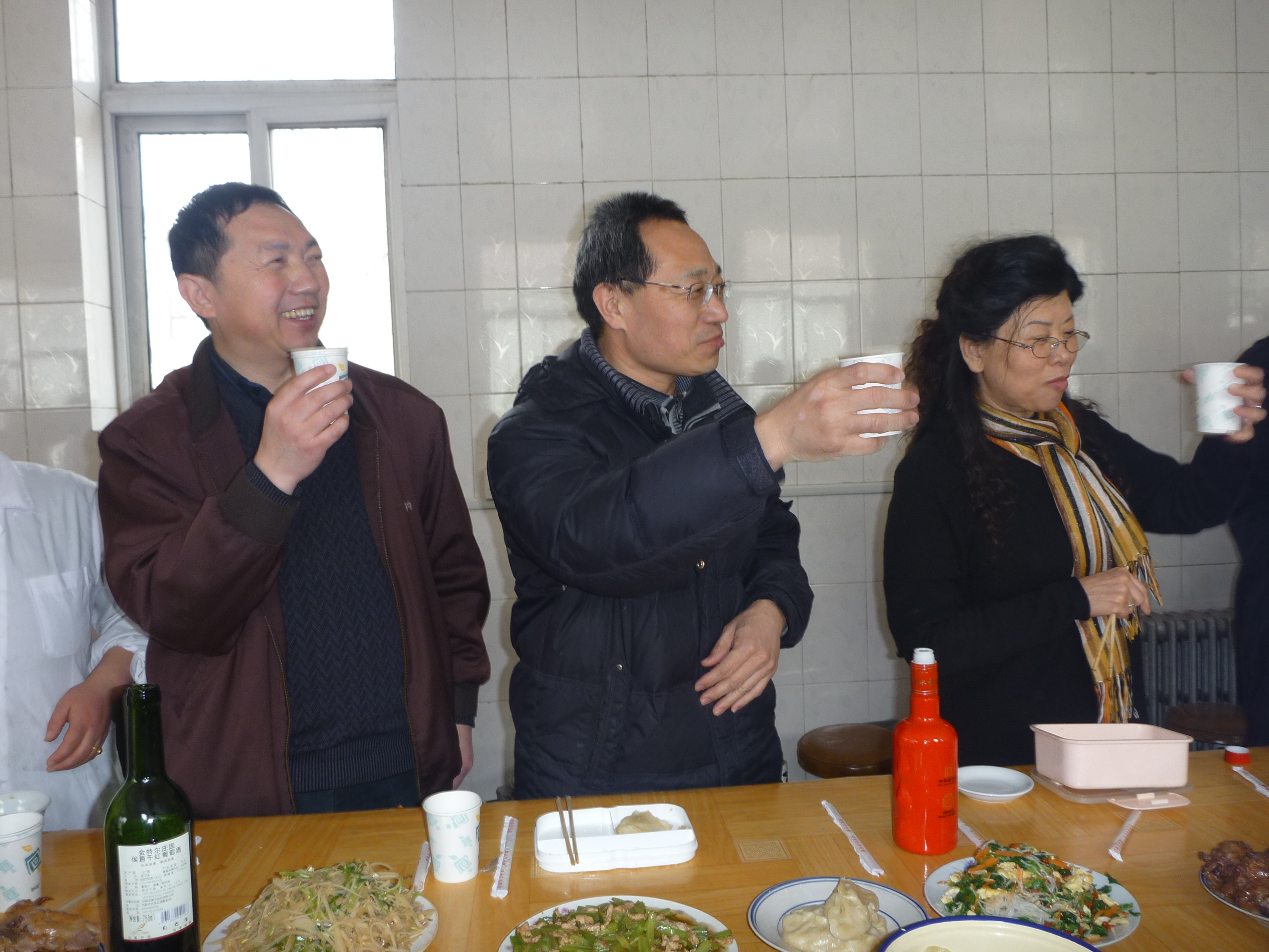 12点38分一道道色香味俱全的菜肴做好,端上饭桌,大家一齐举杯庆祝三八妇女节。老师们围坐