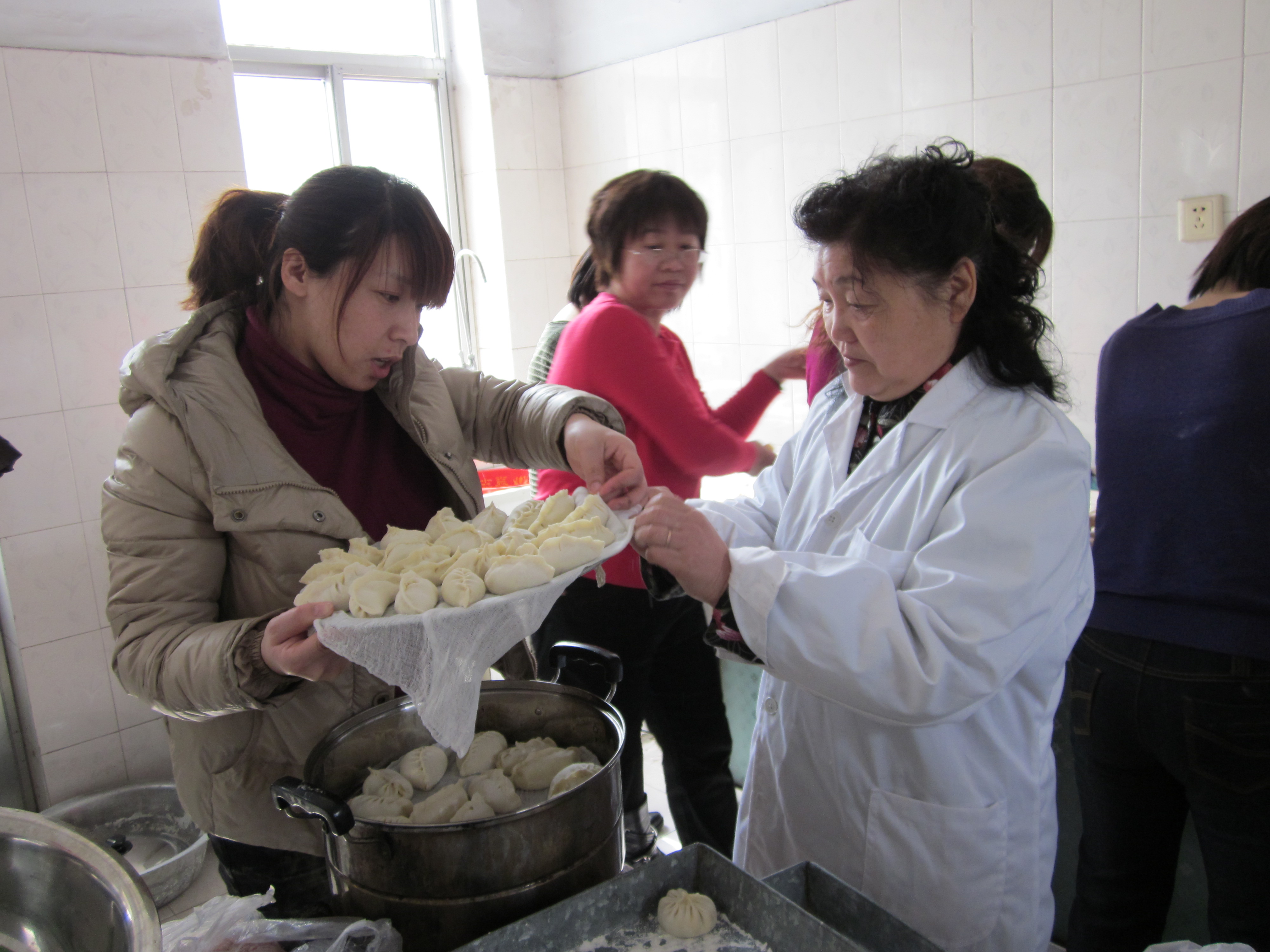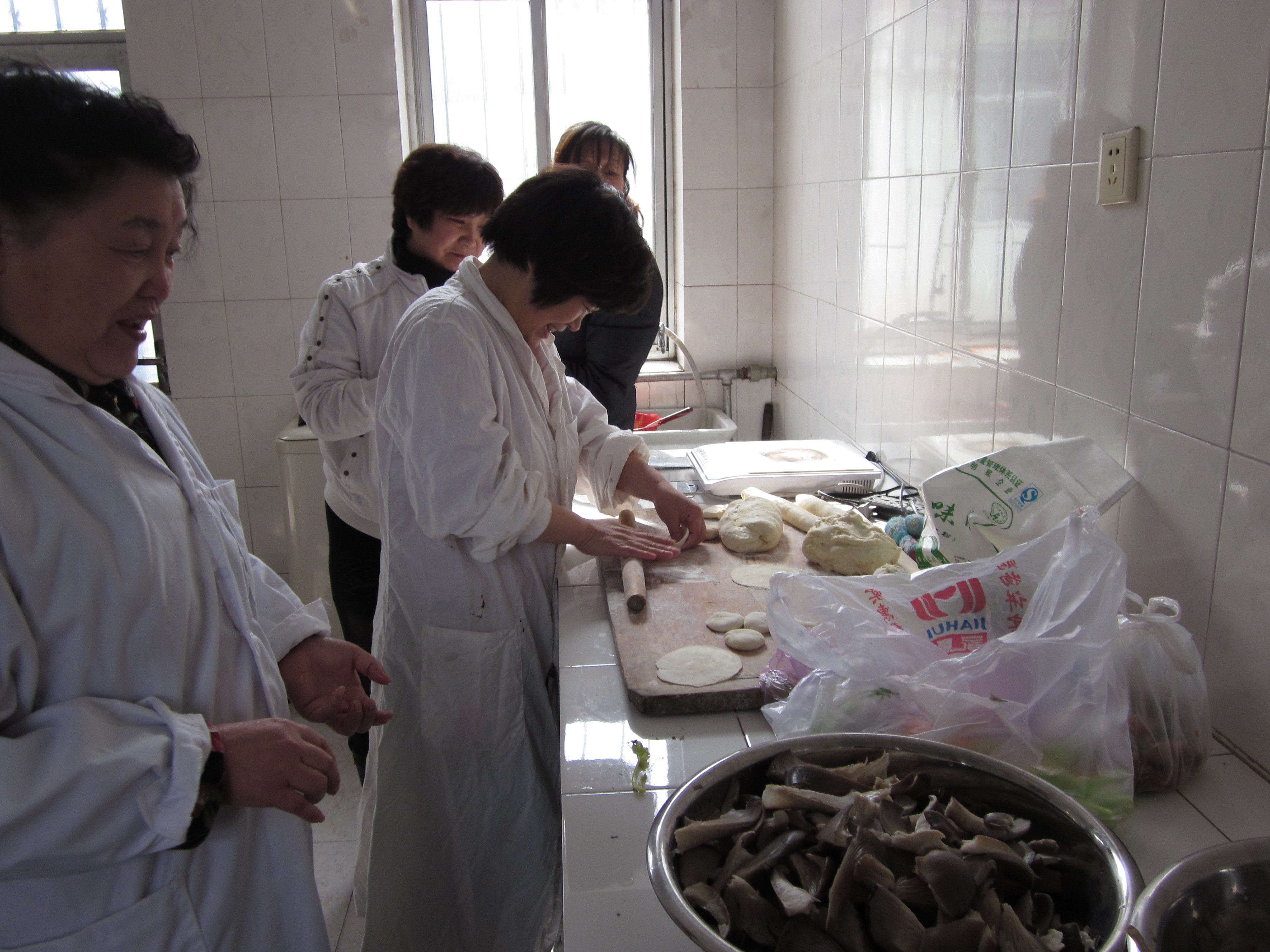 左右没课的女教师自发组成小组开始为中午的厨艺大赛兼品尝盛宴做准备,大家齐动手和面、洗菜、