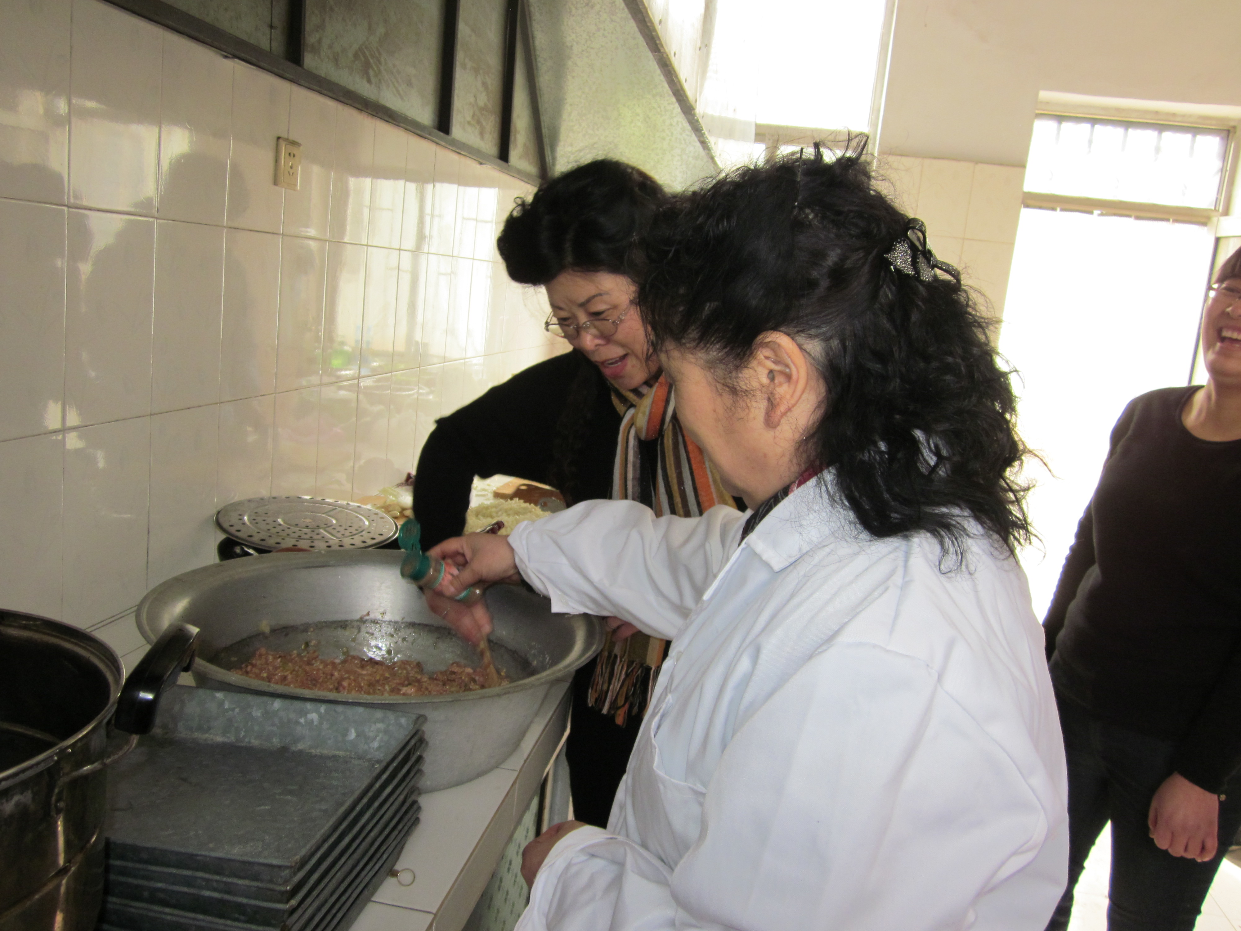 陈翠珍、沈萍两位教授正在合作为饺子馅调味