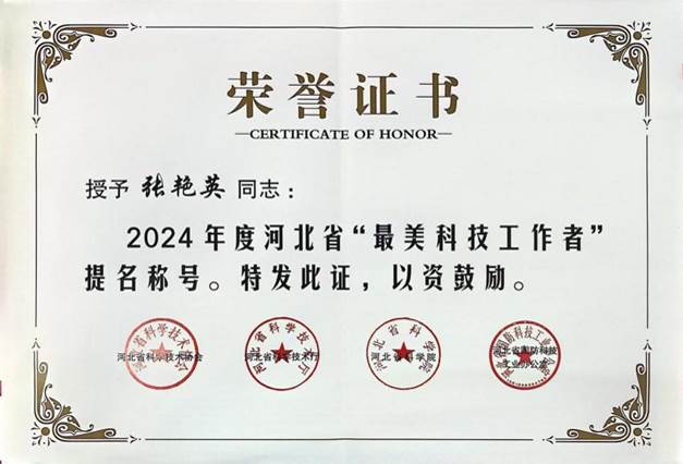 近日,KY开元集官网张艳英教授在2024年度的河北省“最美科技工作者”提名及评选活动中荣获“最美科技工作者”提名称号。该荣誉由省科技厅、省科学技术协会、省科学院、省国防科技工业合作办公室联合颁发,旨在弘扬科学家精神,激发科技工作者责任感。