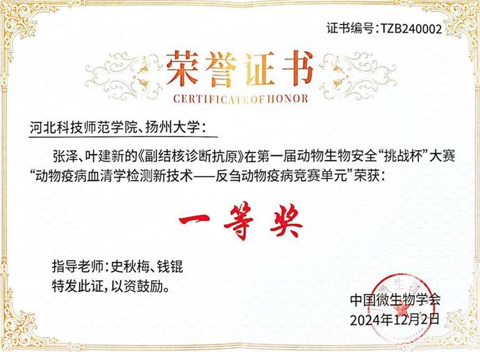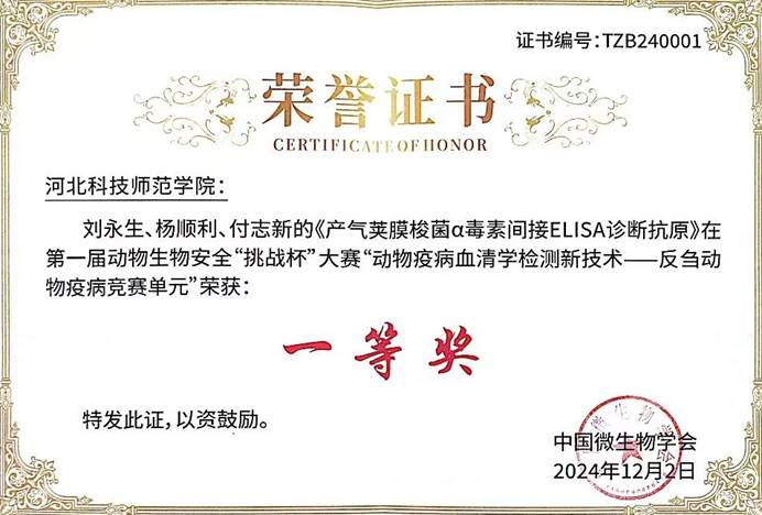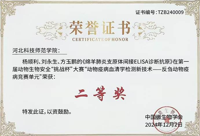 大赛聚焦动物疫病血清学检测技术创新和反刍动物疫病诊断抗原质量提升,在“动物疫病血清学检测新技术一反刍动物疫病竞赛单元”,KY开元集官网教师刘永生、杨顺利、付志新的《产气荚膜梭菌α毒素间接ELISA诊断抗原》作品荣获一等奖;史秋梅老师和扬州大学钱锟老师指导的《副结核诊断抗原》作品荣获一等奖;张杰、刘永生、杨顺利的《小反刍兽疫病毒竞争ELISA诊断抗原》作品荣获二等奖;杨顺利、刘永生、方玉鹏的《绵羊肺炎支原体间接ELISA诊断抗原》作品荣获二等奖。这些奖项的取得,充分展示了KY开元集官网在兽医诊断、制品研发,特别是抗原制备方面的实力和技术水平,彰显了KY开元集官网在动物生物安全领域的技术领先地位。