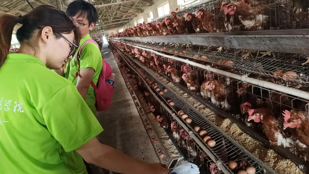 在通过老师联系以后,服务队抵达了目标鸡场。队长魏晓雪主动上前与农户进行交流并跟随农户走进家中。经农户介绍,她养殖有五百只蛋鸡并计划还会继续扩张,在临近养殖室时,鸣叫声便已经先一步传入队员们的耳中,进入鸡场内部后更是十分喧嚣。在鸡场内,服务队成员们发现屋顶有类似电线的牵线与均匀分布的灯泡,经过询问后得知养殖场采用半自动养殖,以自动化喂食与人工收集鸡蛋相结合,那些线便是自动机械的一部分,而灯则会在每天晚上十二点到一点为鸡场提供照明,两者结合使得鸡场拥有十分不错的效率。同时为避免蛋鸡出现传染疾病等,所养殖蛋鸡为注射疫苗的健康幼鸡,养殖过程中也会进行消杀。鸡的饲料也是由农户精心调配。种种的小心照料下,他们的鸡在保证存活率颇高的同时,产量也相当可观。在他们多年来积攒的养殖经验下,鸡场经营的越来越好。